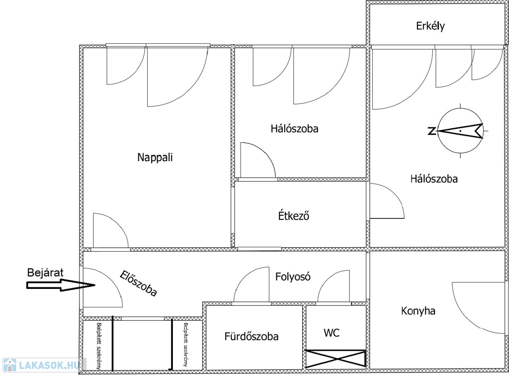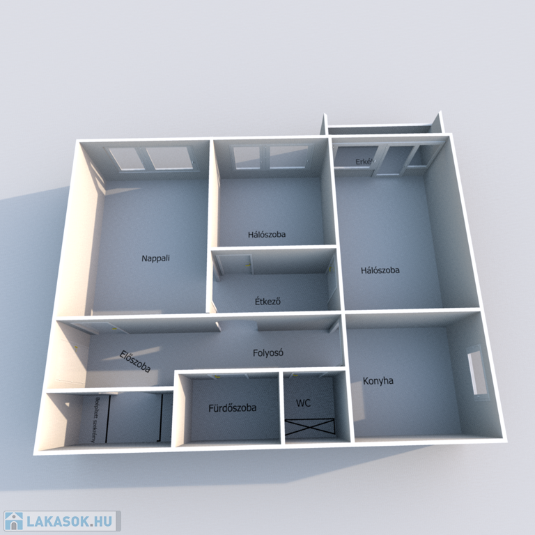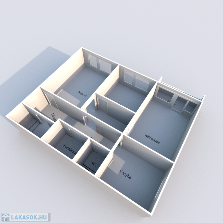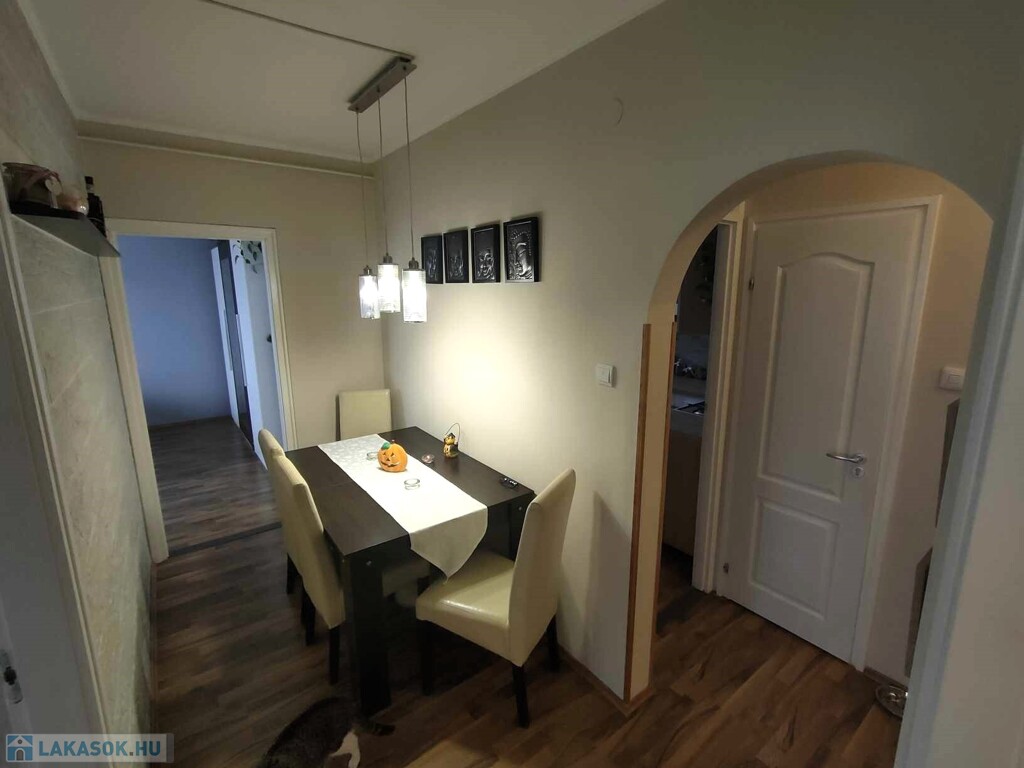 - Helyiségei: előszoba, gardrób, nappali + 2 szoba, konyha, étkező, fürdőszoba, WC külön.