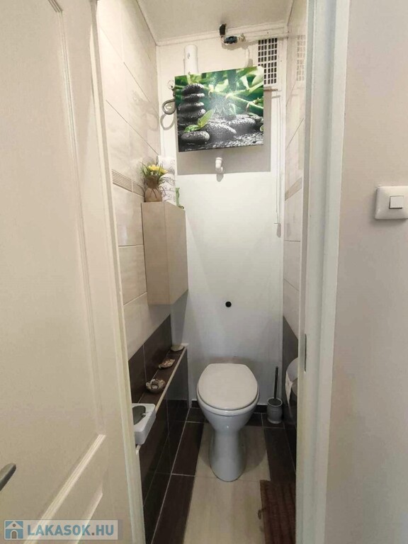- A fürdőszoba, WC járólappal burkolt, a többi helyiség padlózata laminált parketta.