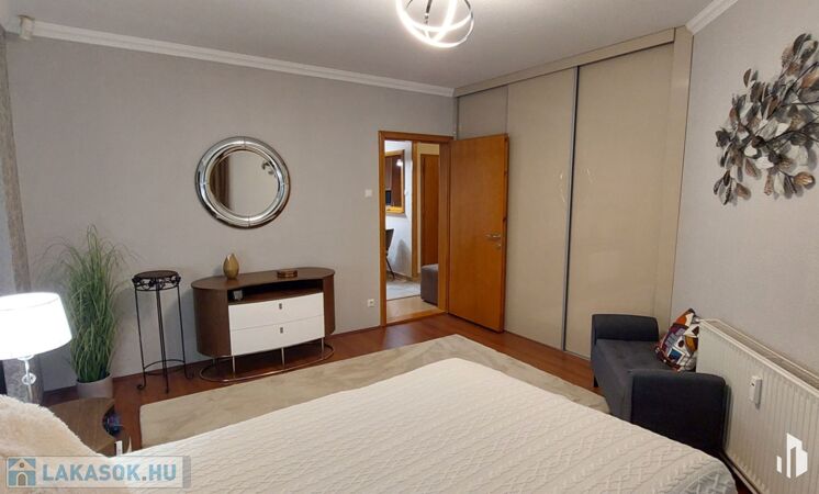 A lakásban több beépített gardrób is található, de az igazi különlegesség az egyik szobából 2022-ben kialakított modern tolóajtós gardrób. Minden ablak zöld parkra néz, hatalmas ablakfelületekkel, világos és csendes lakás. Tájolása É-D.