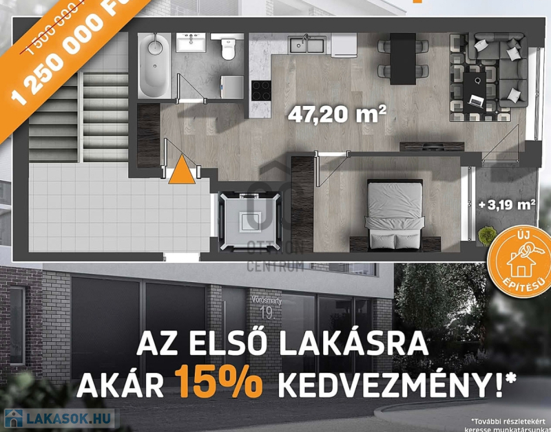 47 m2 alapterületű + 3 m2 erkély tartozik hozzá.