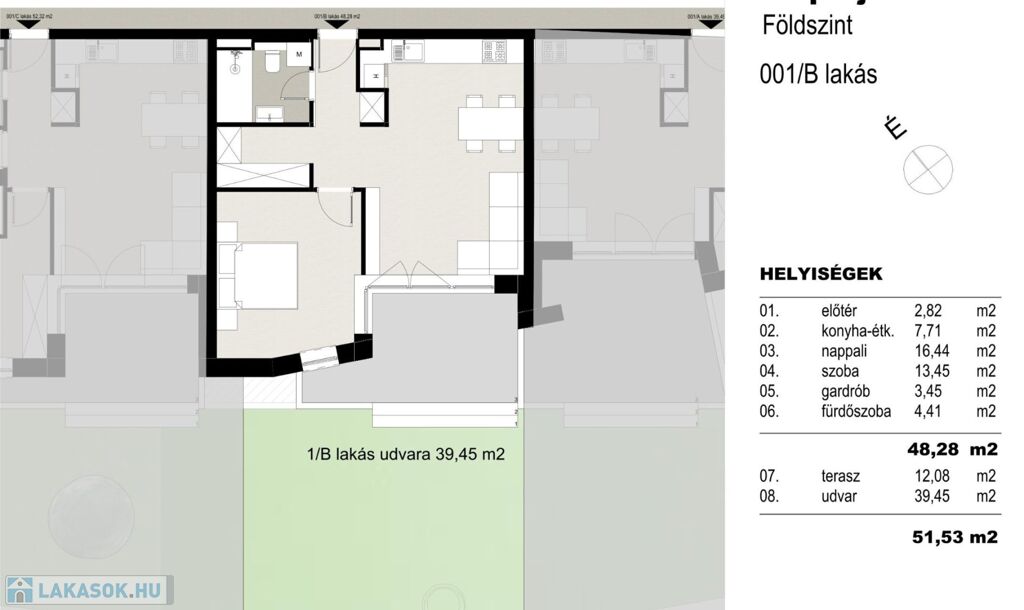 A lakáshoz tartozik egy 40 m²-es kertrész, amely parkosított udvarral és hangulatos terasszal rendelkezik, ahol a kertvilágítás különleges hangulatot teremt az esti pihenésekhez. A redőnyözött ablakok és a szúnyoghálók biztosítják a kényelmet és a privát szférát.