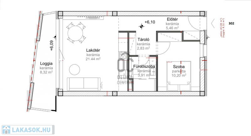 Ez az 3. emeleti lakás 43,84 nm-es, nappali-étkező-konyha +1 szobás, 8,32 nm-es loggiával.
