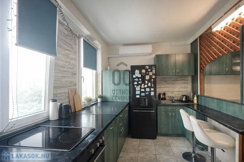 A lakás a Károlyi Mihály utcán, egy panelprogramos, rendezett társasházban található, műanyag nyílászárókkal és mért távfűtéssel. A 7. emeleti otthon klímás, külön fürdőszobával és wc-vel rendelkezik, az erkély pedig pihenésre vagy reggeli kávézáshoz is ideális.