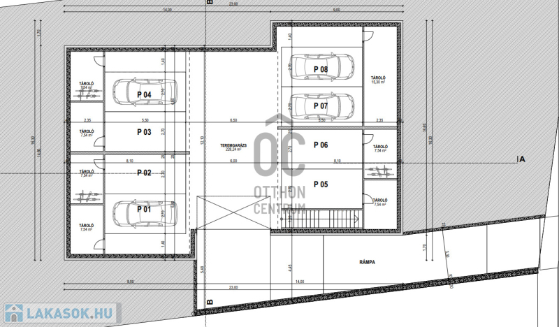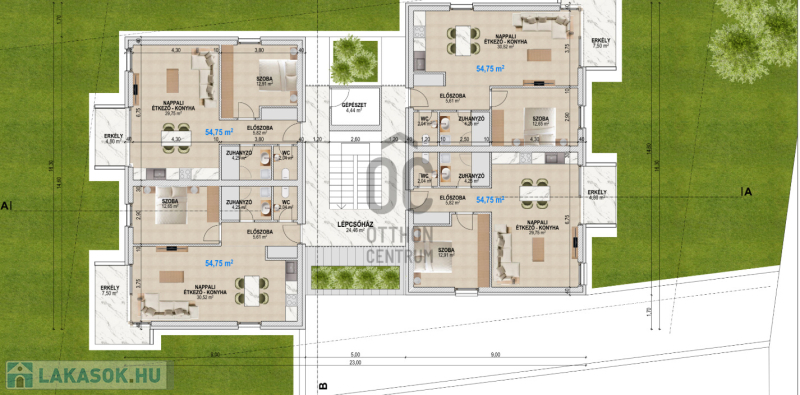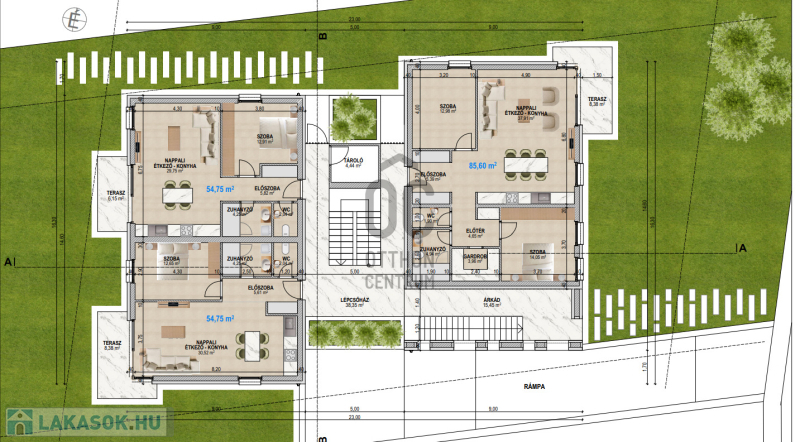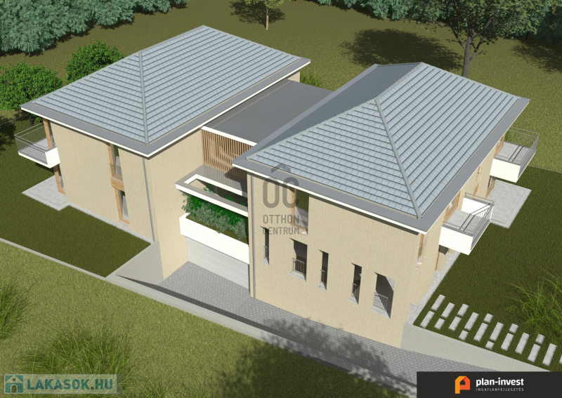 7 lakásos társasház, földszint + emeleti kialakítással, garázsok pince szinten .