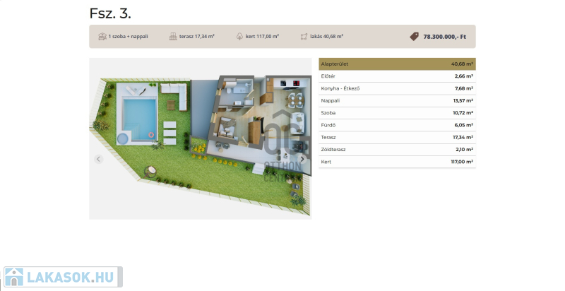 Ez a földszinti kertkapcsolatos lakás 40,68 nm-es, nappali-étkező-konyha +1 szobás, 17 nm-es terasszal és 117 nm-es kerttel.