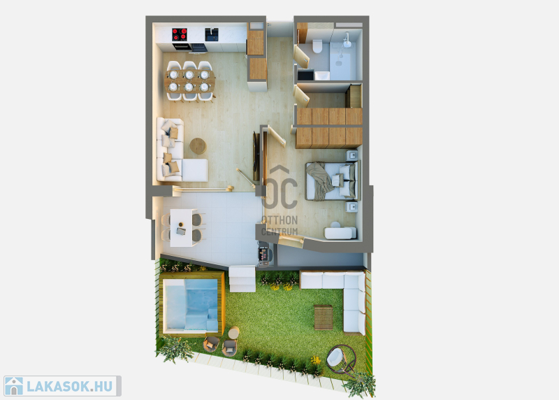 Ez a földszinti kertkapcsolatos lakás 50 nm-es, nappali-étkező-konyha +1 szobás, 10,6 nm-es terasszal és 32 nm-es kerttel.