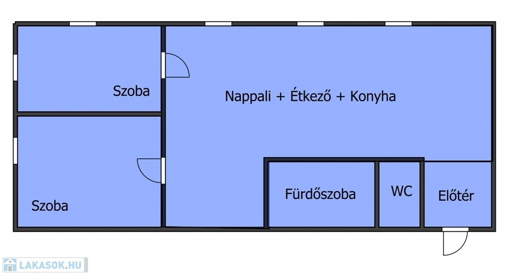 Szobák: 2 külön nyíló szoba, Nappali + Étkező + Konyha, WC, Fürdőszoba, Előtér