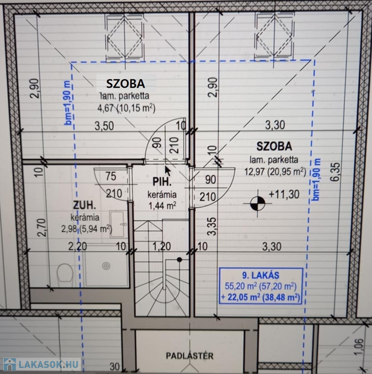 Az ingatlan pontos méretei: Nettó alapterület 95.68m², ebből a hasznos alapterület, ahol a belmagasság legalább az 1,90 métert eléri 77.25m².