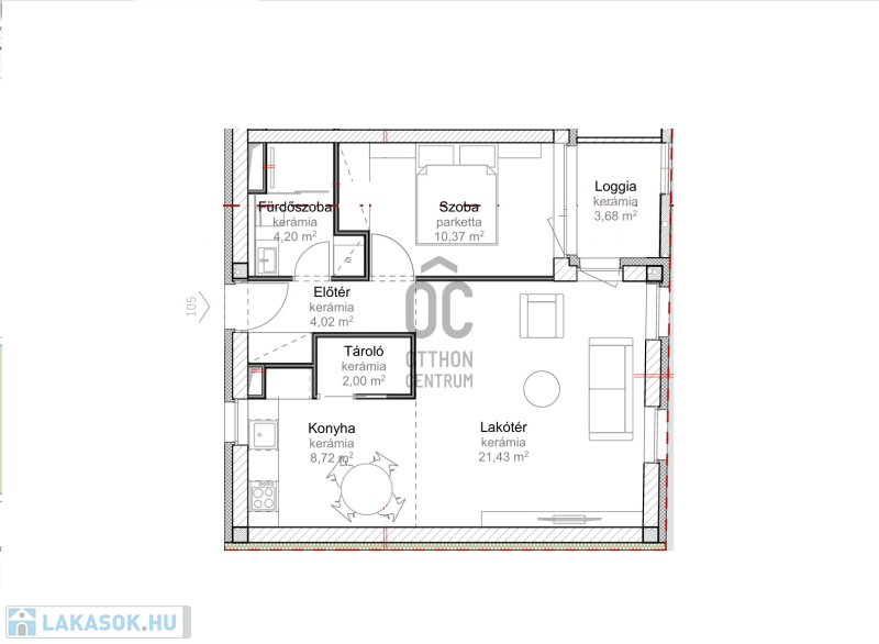 Ez az 1. emeleti lakás 50,74 nm-es, nappali-étkező-konyha +1 szobás, 3,68 nm-es loggiával. Nappali+ 2 szobássá alakítható.