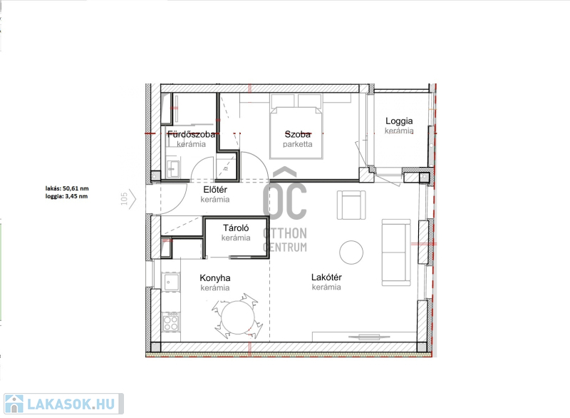 Ez az 2. emeleti lakás 49,47 nm-es, nappali-étkező-konyha +1 szobás, 6,03 nm-es loggiával. Nappali+ 2 szobássá alakítható.