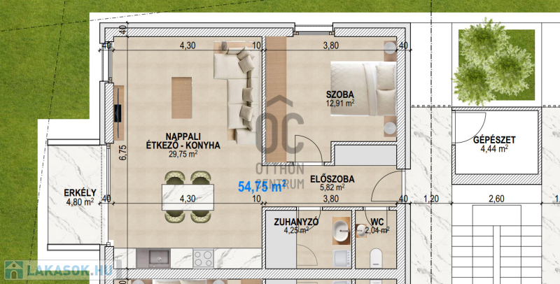 Az ingatlan az 1. emeleten helyezkedik el, 54,75 m2 alapterületű + 4,8 m2 erkély tartozik hozzá.