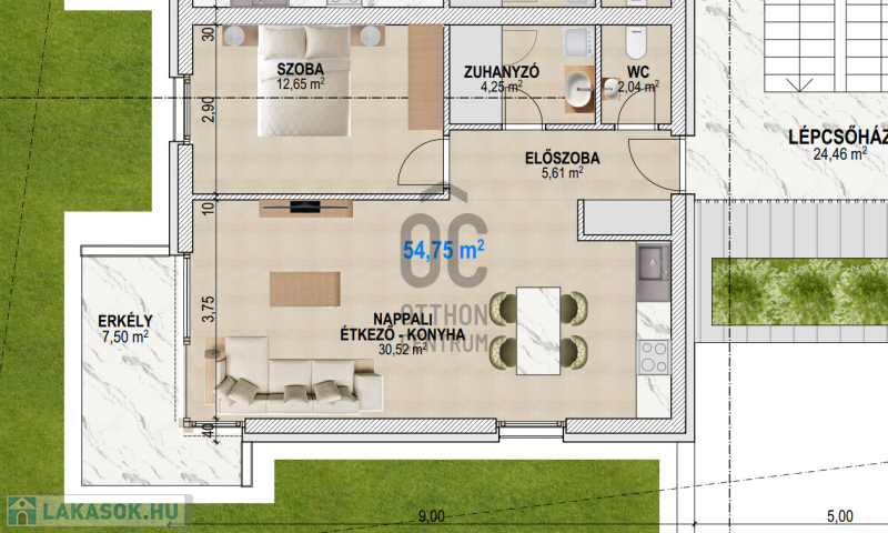 Az ingatlan az 1. emeleten helyezkedik el, 54,75 m2 alapterületű + 7,5 m2 erkély tartozik hozzá.