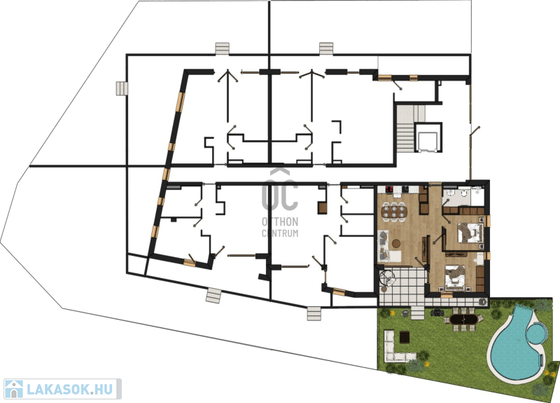 Ez a földszinti kertkapcsolatos lakás 53,42 nm-es, nappali-étkező-konyha +2 szobás, +13 nm-es terasszal és 83 nm-es kerttel.