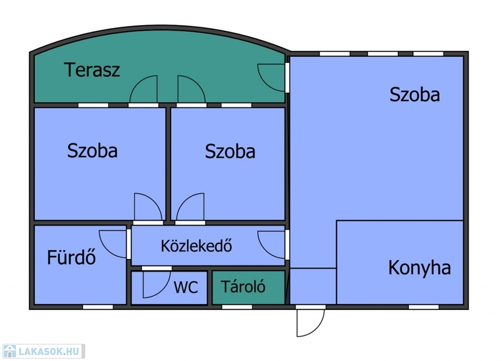- 2 hálószoba, Nappali + Konyha + Étkező, Fürdőszoba, Tároló