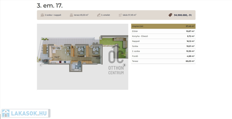 Ez a 3 emeleti penthouse lakás 57,45 nm-es, nappali-étkező-konyha +2 szobás, 65 nm-es tetőterasszal és 32 nm-es.