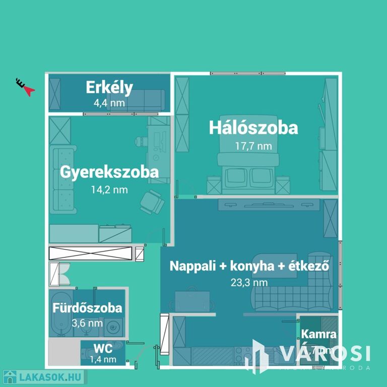 - **Lakótér:** 70 m² + 4 nm loggia