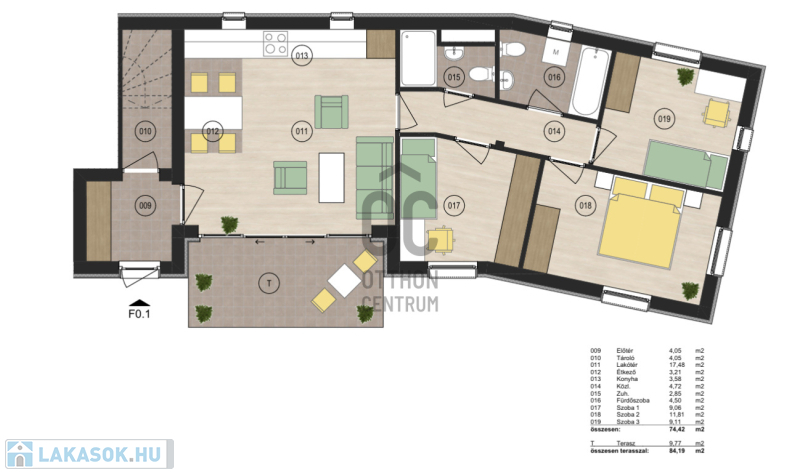 Földszinten : 1 db lakás ( 74,42 m2 ) + teraszkapcsolattal ( 9,77 m2 ) , 5 db gépkocsitároló és 5 db tároló