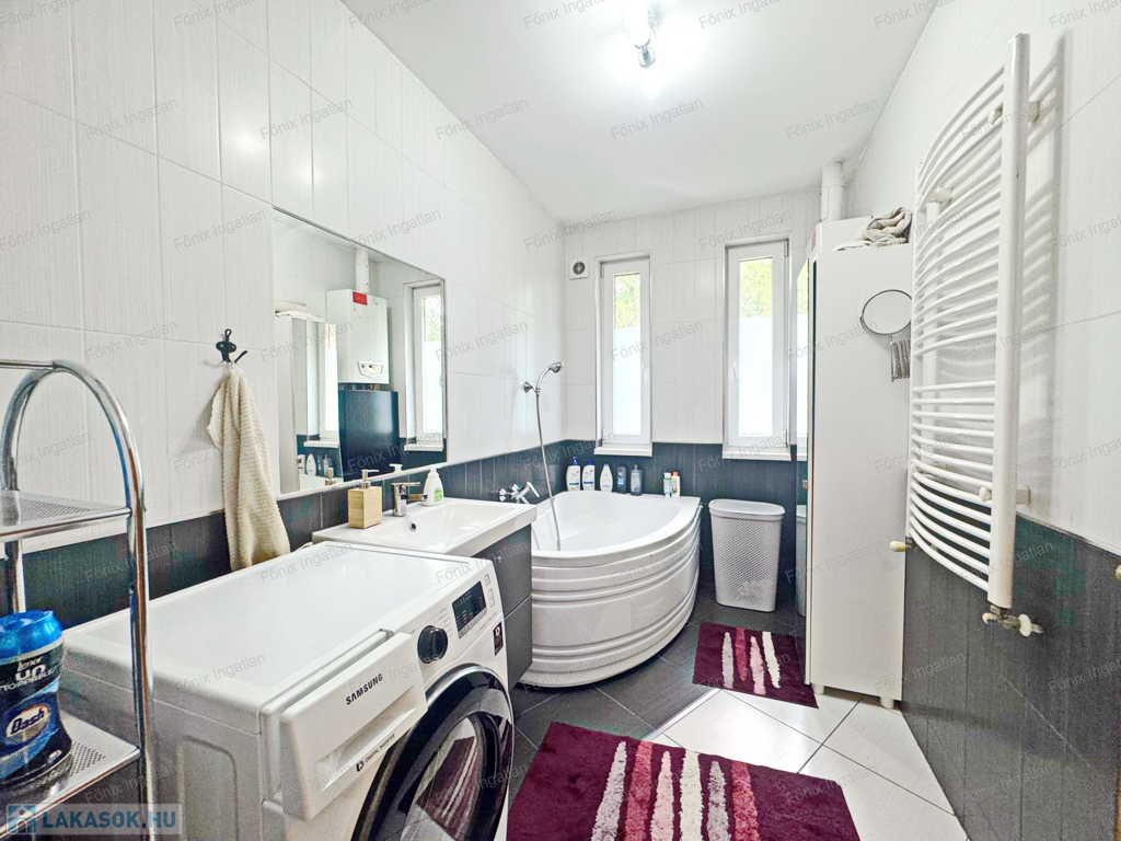 Az ingatlan homlokzata 10 cm szigeteléssel van ellátva. A gázfogyasztás 100.000. forint/év, saját kerti tároló, locsolási lehetőség, riasztó, kktg 2200 forint.