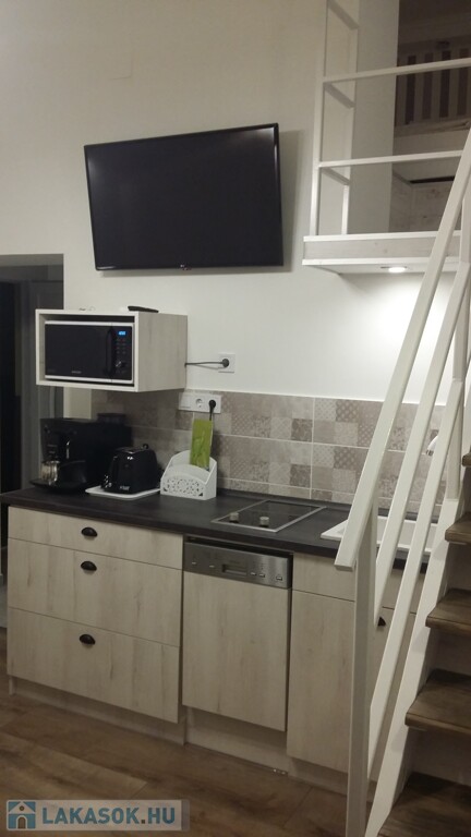 A nagyobb lakrész helyiségei: amerikai konyhás nappali, 1 hálószoba, 5 nm-es galéria, fürdőszoba, WC külön helyiségben, közlekedő.