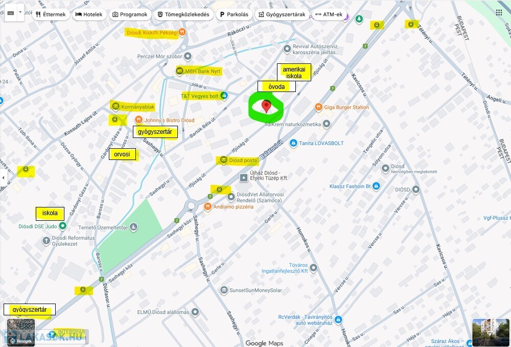 - bolt, posta, orvosi rendelő, gyógyszertár, ATM, iskola, óvoda, buszmegállók (Volán, BKK)