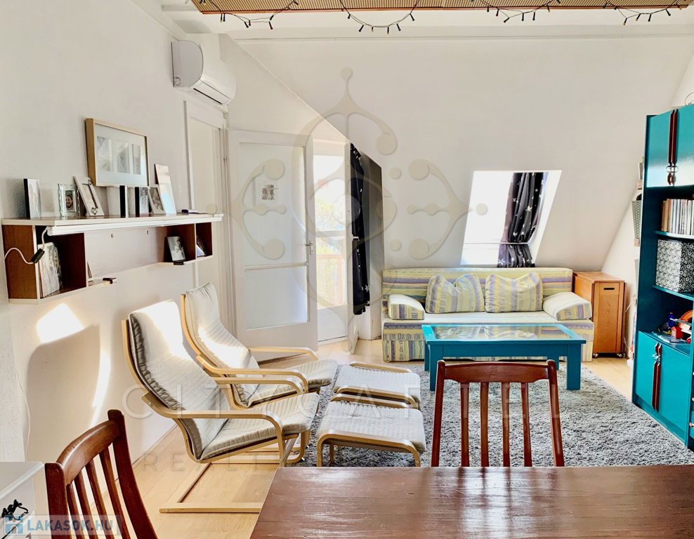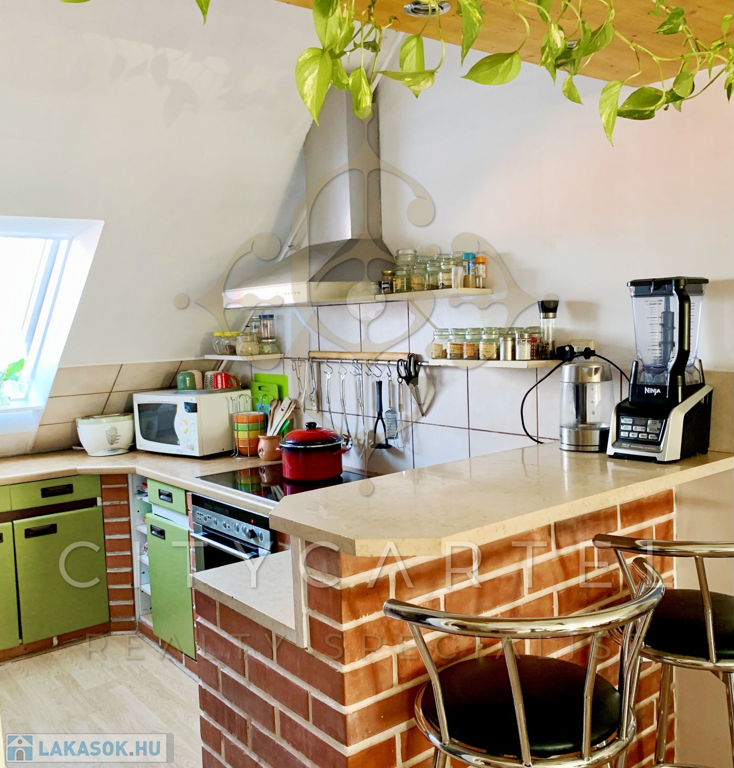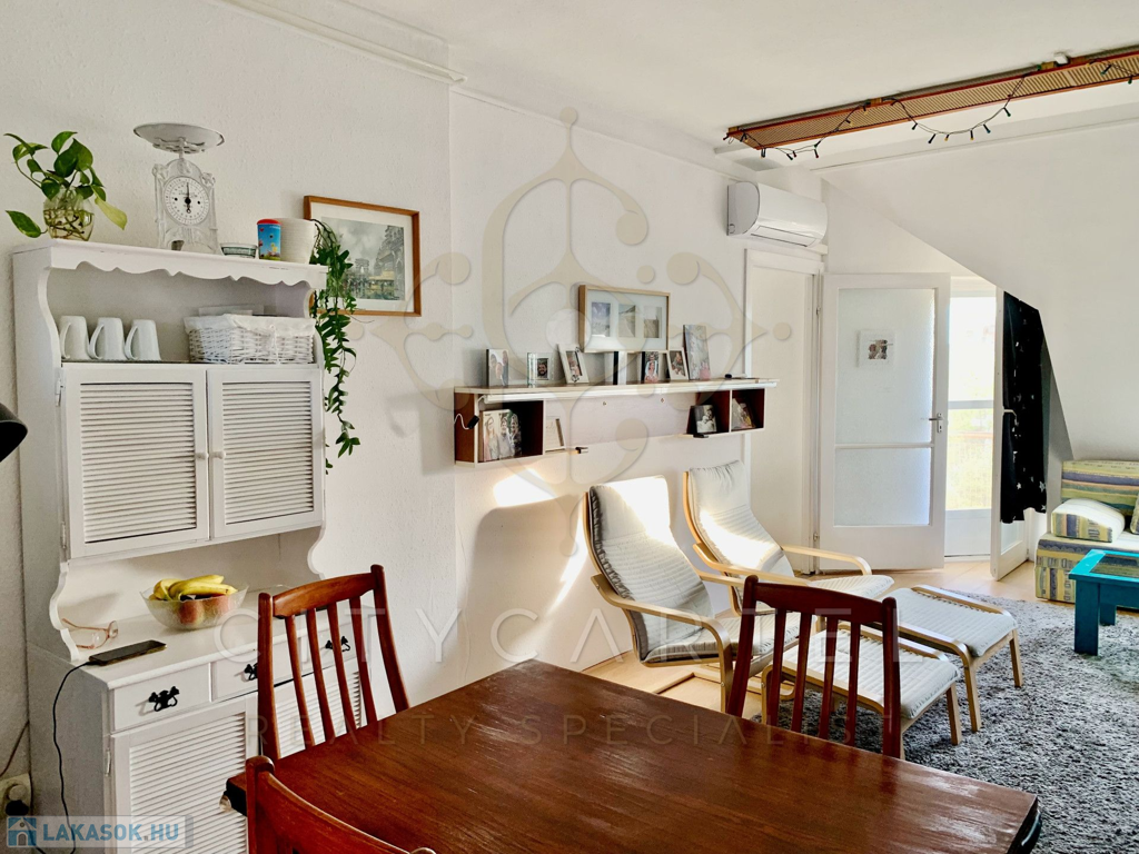 Átlagos állapotú, 2+1 szobás manzárd lakás kínálunk eladásra a kellemes hangulatú Duna-parti kisváros centrumában. Az iskola, óvoda, bankok, buszpályaudvar közvetlen közelében álló, téglaépítésű ház az 1980-as évek elején épült, fákkal, bokrokkal, buja növényzettel betelepített udvara kulturált parkolónak ad helyet. A kifogástalan statikai állapotban lévő épület tetőterében kialakított, átlagos állapotú lakás vastag, száraz falai 100 nm hasznos alapterületű lakóteret zárnak közre, amelyen tágas étkező-nappalihoz két nagyobb és egy kisebb méretű, világos hálószoba, konyha, előszoba, fürdőszoba és WC kapcsolódik. A déli fekvésű, gondozott parkra néző loggia kiváló lehetőséget kínál az itt élők számára a gondtalan pihenésre. A ház fűtéséről központi gázkazánnal üzemeltetett fűtésrendszer gondoskodik.