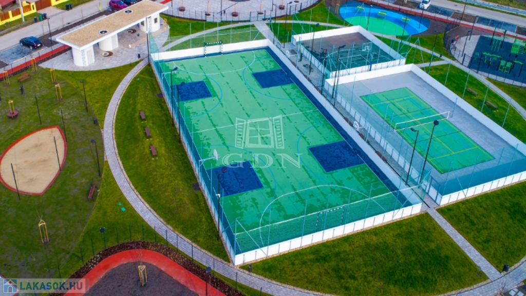 A lakóparkban épült új sportpark számos lehetőséget nyújt a sportolni, pihenni vágyóknak.