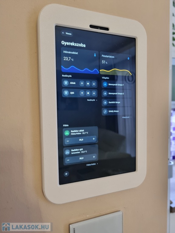 A fűtést gázcirkó (padlófűtés és radiátorok), valamint a nappaliban egy fatüzeléses kandalló biztosítja, nyáron az ingatlan klimatizált. Okosotthonként is vezérelhető a ház 2 kijelzőről és applikációról. A ház ablakai automata redőnyösek, valamint szúnyoghálóval ellátottak.