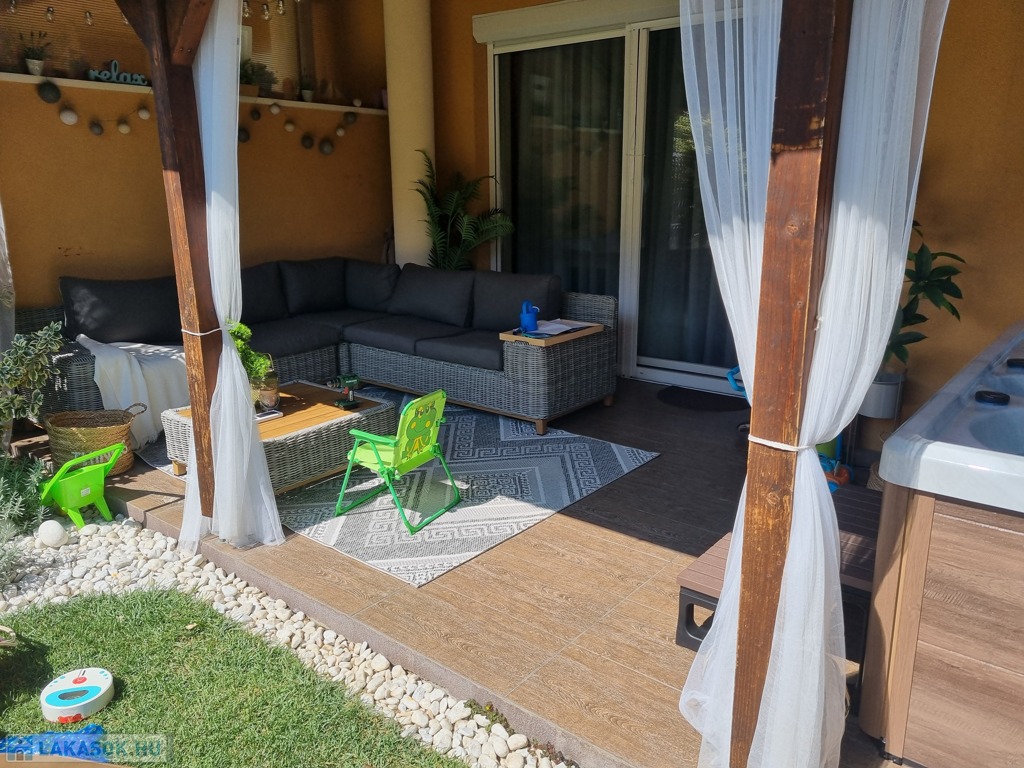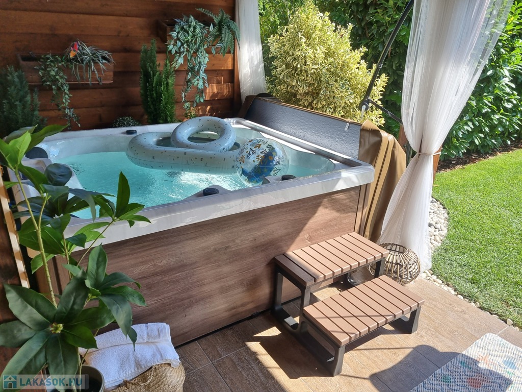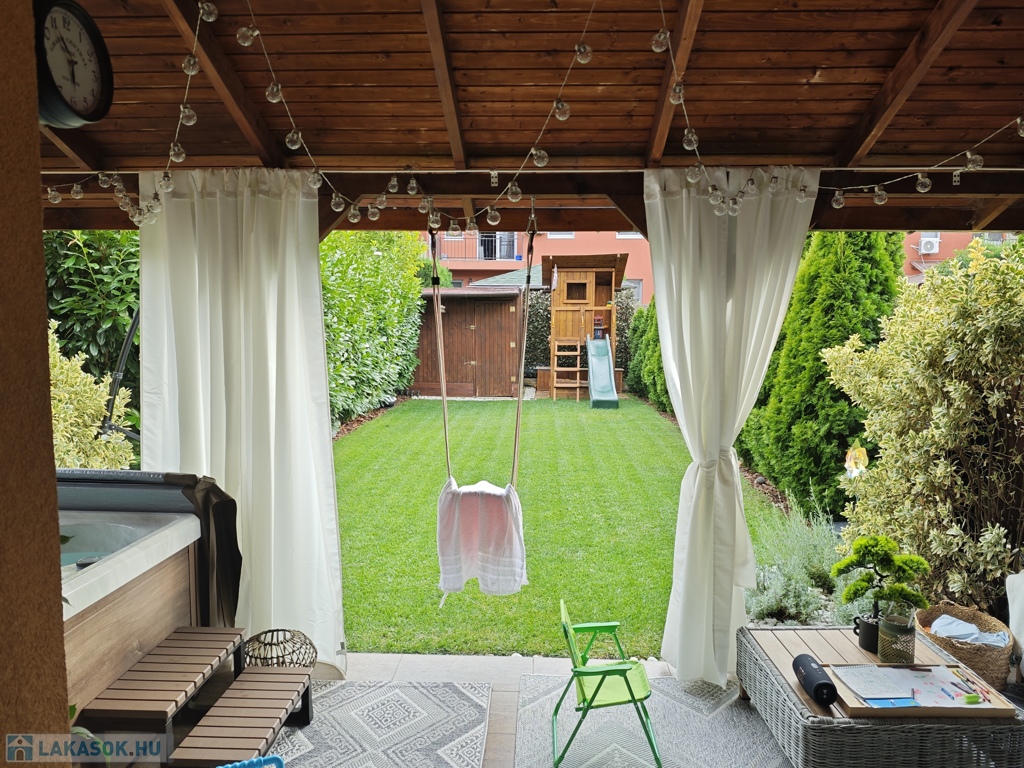 A földszinti terasz fedett, így télen-nyáron remekül használható, egy 4 személyes jakuzzinak és kerti ülőgarnitúrának is helyet ad. A kertben a gyepszőnyeg, az örökzöld tuják és a babérmeggy sövény öntözését automata locsolórendszer biztosítja. A kert végében található egy kb. 4 m²-es faház a kerti szerszámok tárolására.