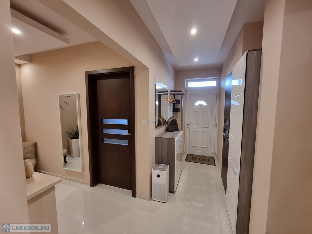 Viacolor burkolatú járda vezet a kaputól a bejárati ajtóig. Parkolni az elektromos kapuval ellátott zárt előkertben, fedett autóbeállóban lehetséges, ahol elektromosautó-töltési lehetőség is biztosított (3 x 16A). Az előkertben egy kerékpártároló is helyet kapott. A védelmet az érintőképernyős Paradox riasztórendszer, valamint videós kaputelefon biztosítja. Az épületben minőségi burkolatok vannak. A konyhában található minőségi konyhagépek (Gorenje sütő, mikró, indukciós főzőlap, beépített páraelszívó) a vételár részét képezik.