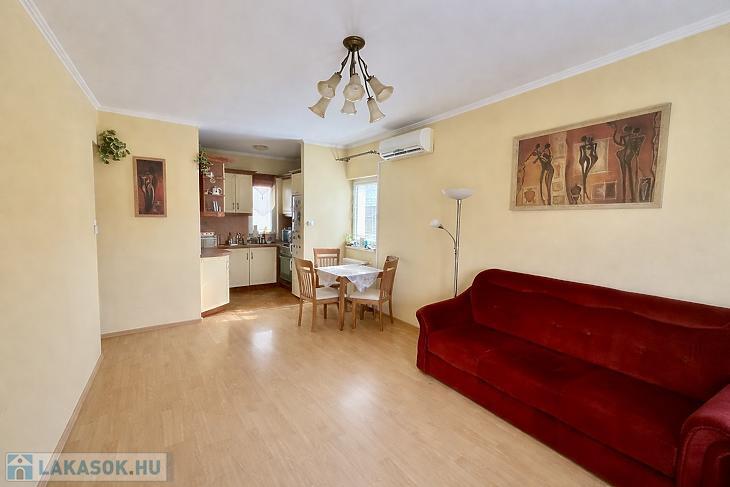 Elosztása praktikus: amerikai konyhás nappalival, 1 külön nyíló hálószobával, valamint fürdőszobával és WC-vel került kialakításra. A fűtést turbó kombi cirkó biztosítja, a nyári nagy melegben pedig egy hűtő–fűtő klíma gondoskodik a kellemes komfortérzetről.