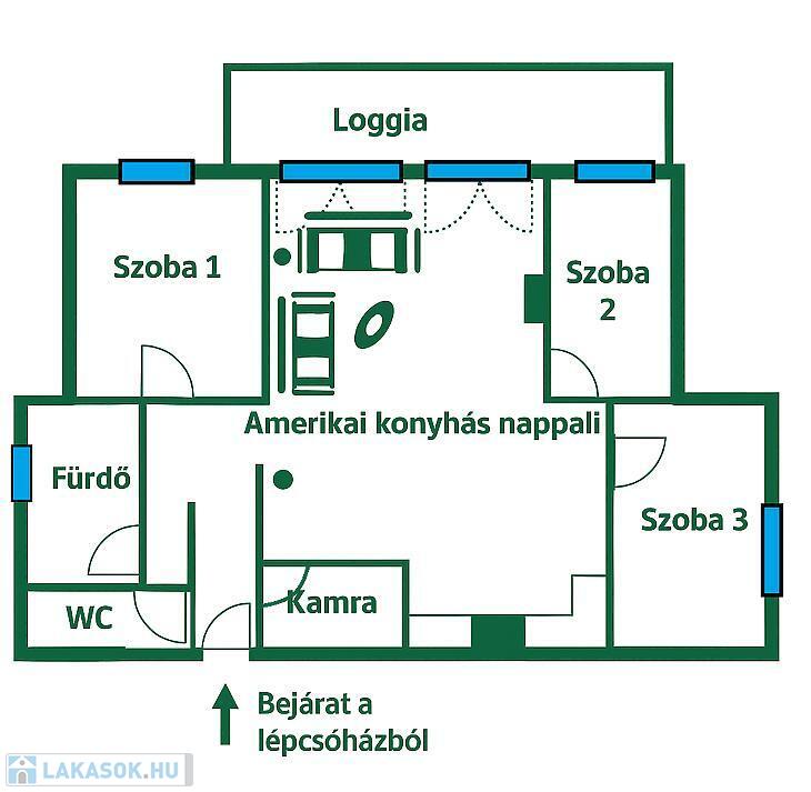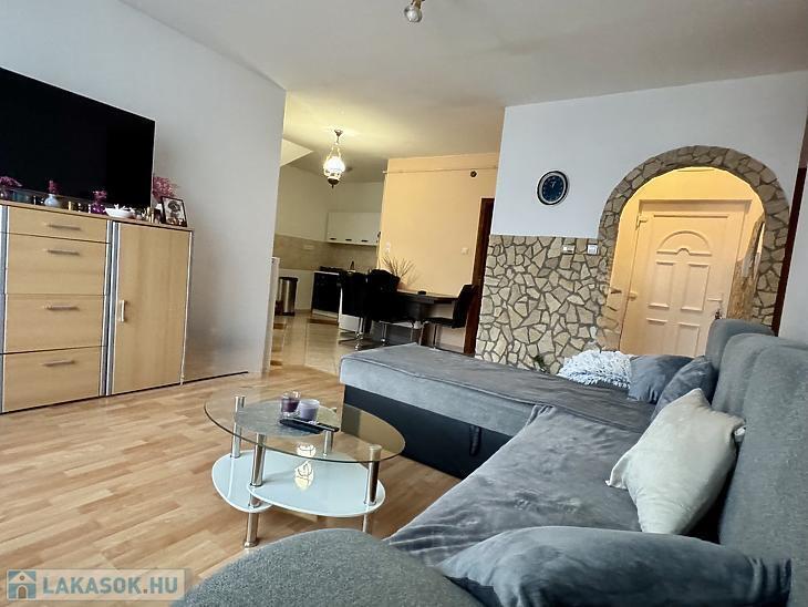 Az amerikai konyhás nappali mellett, előszobával, fürdőszobával külön WC-vel, és 3 hálószobával rendelkező lakás.