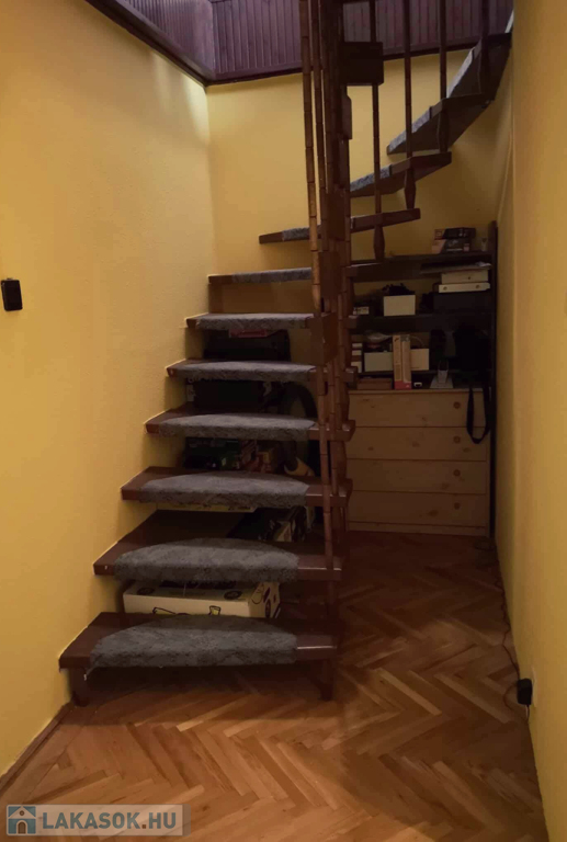 Az alsó szinten nappali, háló, konyha, fürdő és WC, míg a felső szinten három szoba, egy fürdő, valamint szintenként egy-egy erkély biztosítja a kényelmet. A két szintet belső lépcső köti össze, ugyanakkor megmaradt a két bejárat lehetősége is – így ez az otthon akár két generáció vagy lakás + vállalkozás céljára is kiváló választás lehet.
