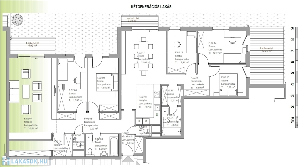 -F.02 lakás 164,3 m2; terasz: 32,85 m2; kert: 168,36 ár: 248.000.000,-Ft.