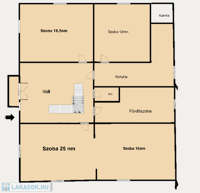 A bejárati ajtón belépve, a lépcsőkön felhaladva a tágas előszobába érkezünk, ahonnan minden helyiség nyílik: az utcára néző két nagy szoba (melyeket térelválasztással használtak nappali+ hálóként), egy-a két ablaka által világos- 18,4 nm-es nagyobb szoba, és a kisebb 12nm-es, melyek mindegyike az udvarra néz, az L alakú konyha (ehhez kamra is tartozik), a kádas fürdőszoba, a külön WC.