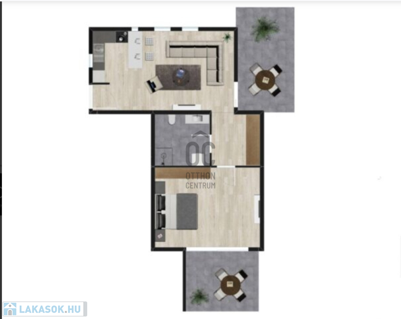 A 58,18 m2-en a lakás magában foglal egy kellemes előszoba-konyha-étkezőt, egy tágas nappalit, egy fürdőszobát, egy szép hálószobát, egy mellékhelyiséget, egy gardróbot és két méretes, RÉSZBEN fedett teraszt, mely gyönyörű zöldövezeti területre néz.