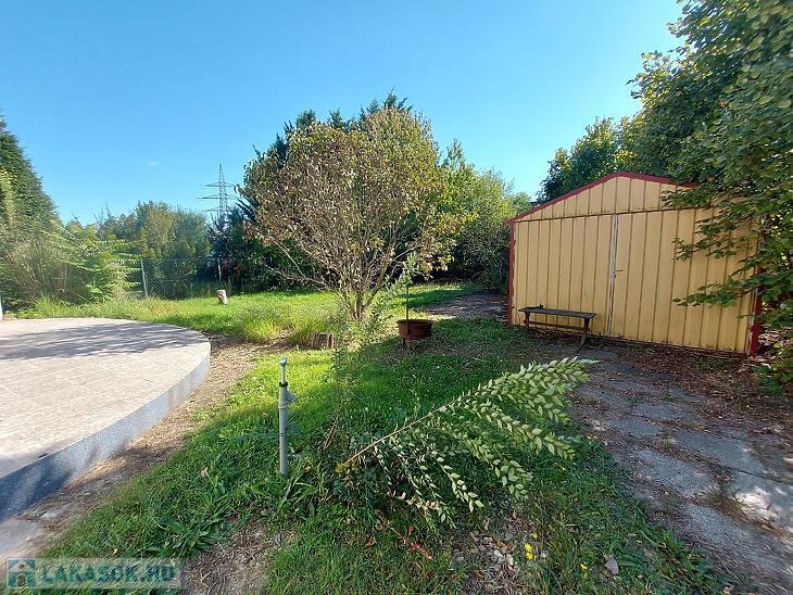 A lakáshoz tartozik egy könnyűszerkezetes garázs, egy gépkocsibeálló, valamint egy fúrt kút is.