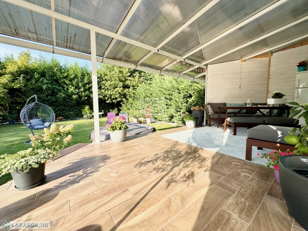 Göd kedvelt városrészén, Oázis lakóparkban, kertvárosi környezetben, csendes aszfaltozott mellékutcában, 2009-ben magas műszaki színvonalon épült, 99 nm-es lakóterületű, nappali + 2 háló + gardrób szobás, (könnyedén minimális költséggel nappali+3 hálóssá alakítható!!), amerikai konyhás, közvetlen kert-teraszkapcsolatos, (kert 210nm + terasz 16 nm) kiváló elosztású, külön nyíló szobás, napos-világos fekvésű, alacsony fenntartású, modern, kondenzációs gázkazán fűtésű, újszerű állapotú, ikerház jellegű, klimatizált, riasztórendszerrel felszerelt lakás, beépített, gépesített konyhával, felszíni gépkocsi beállóval, 8 nm-es fűtött tárolóval, saját, közvetlenül a lakás nappaliából megközelíthető 210 nm-es, gyönyörűen karbantartott, öntözőrendszerrel kiépített kerttel, fúrt kúttal eladó.
