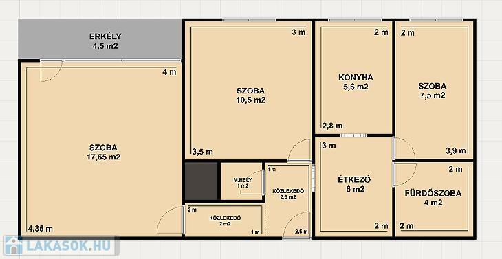 3 szoba, ablakos konyha, kádas fürdőszoba, mellékhelyiség, étkező, erkély.
