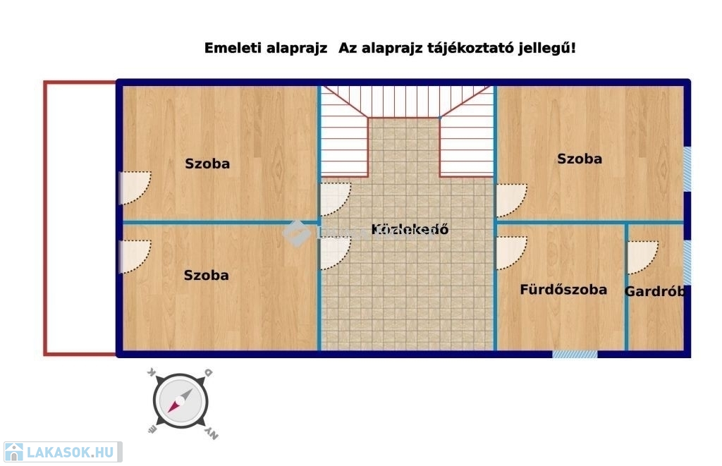 Az emeleten a közlekedőből nyílik 3 db hálószoba (2-ből kijárattal az erkélyre) és egy sarokkádas fürdőszoba, melyből nyílik még egy tágas gardrób is.