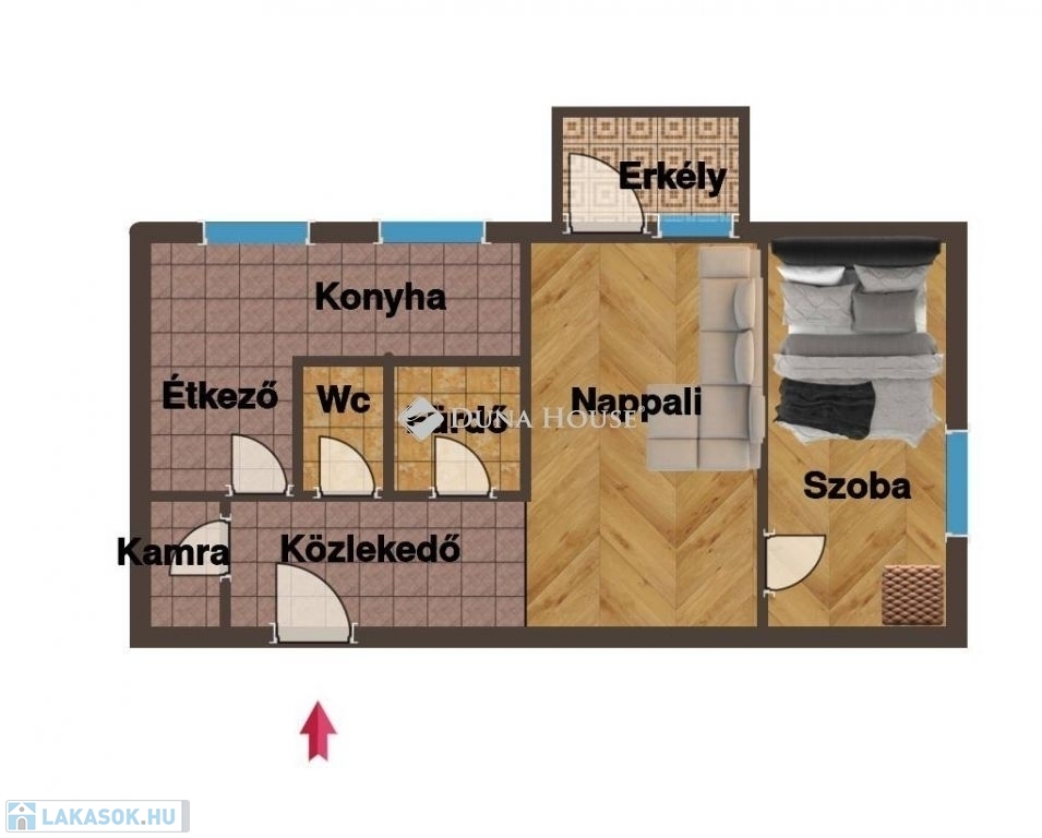 Kialakítása: tágas nappali, szoba, közlekedő, kamra, külön wc, fürdő, étkező, konyha, erkély.