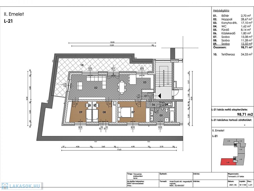 A 98,70 m2-es, 2. emeleti (L21), D fekvésű lakás HELYISÉGEI:
