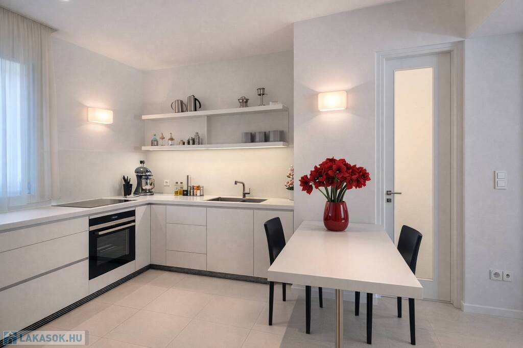 A napfény végigsimít a magasfényű felületeken, a tér pedig egyszerre letisztult, elegáns és megnyugtató – pontosan az az érzés, ami miatt ezt a lakást látni kell.
