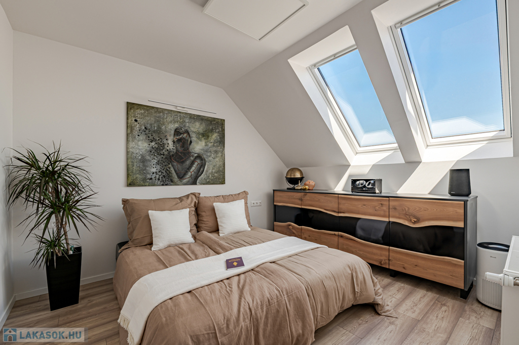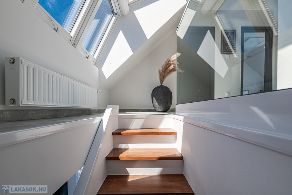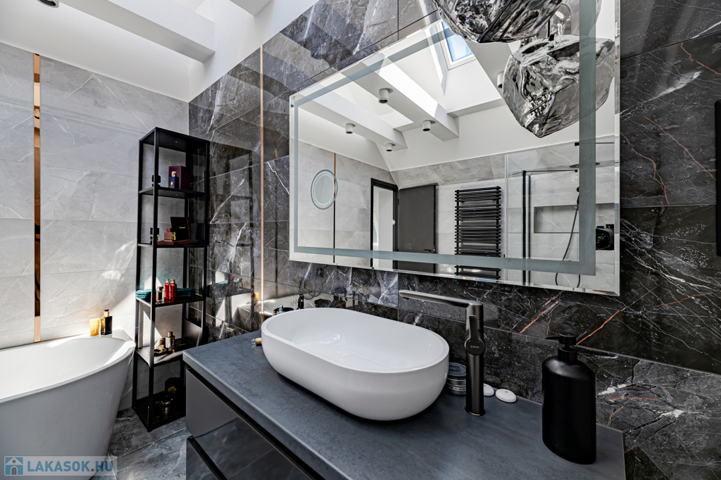 A lakás egyik különlegessége a felső szinten található hatalmas, világos fürdőszoba, a látszógerendákkal, kényelmes méretű zuhannyal, térkáddal, hangulatfényekkel.