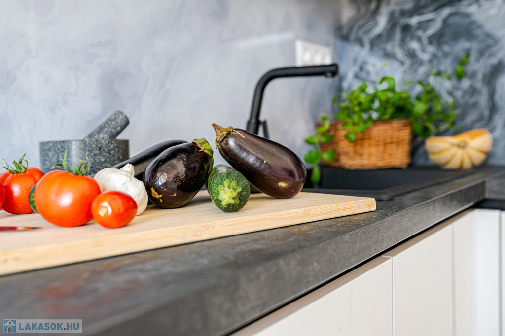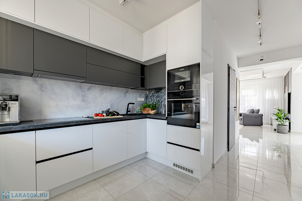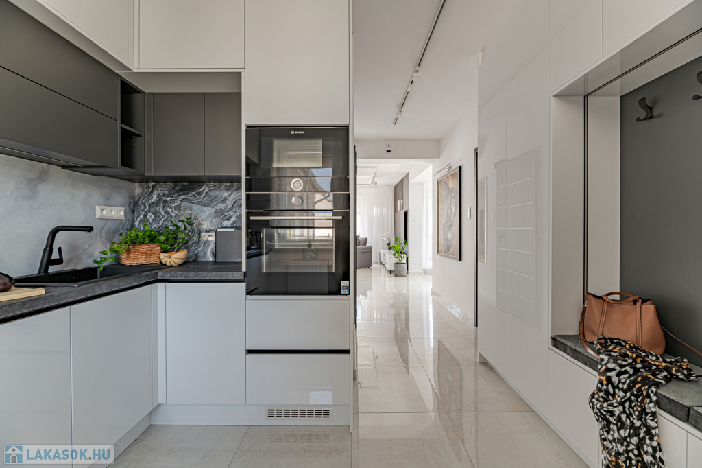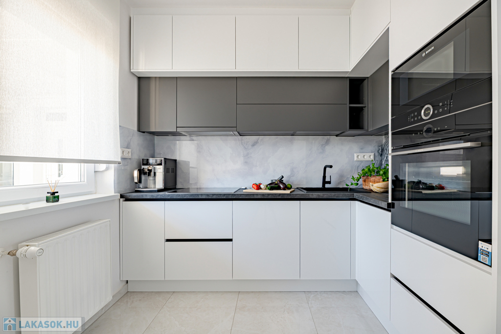 A konyhabútor, a tálaló, a beépített előszobaszekrény, a fürdőszobai szerkények, mind EGYEDI tervek alapján készültek, magasfényű fehér és antracit színben.