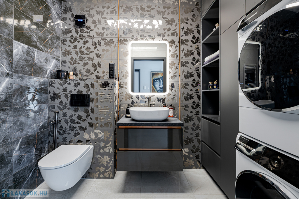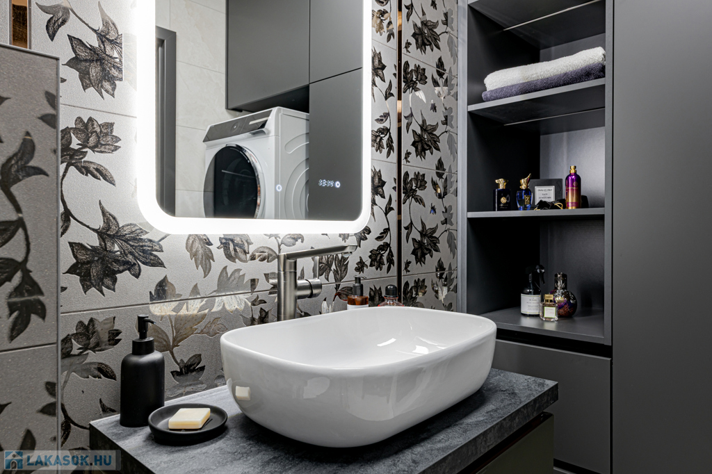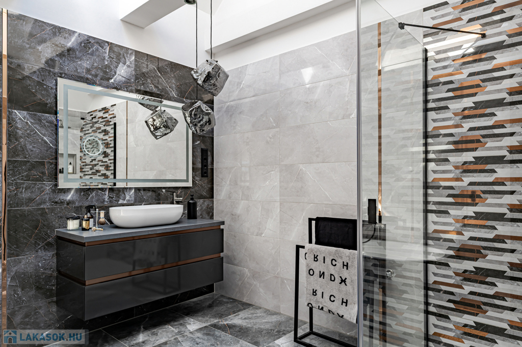 A fürdőszobákban prémium minőségű burkolatokat, Deante titánium, modern csaptelepeket, egyedi gyártású mosdószekrényeket, led prémium line érintőkapcsolós tükröt találunk.