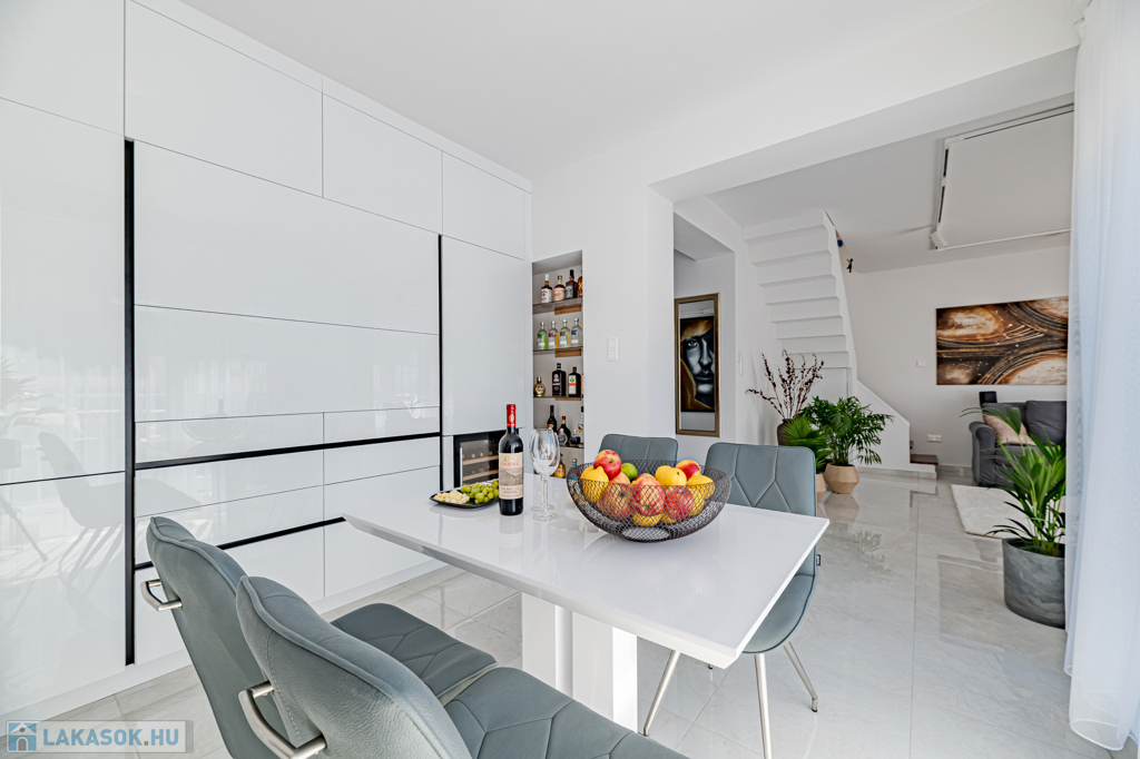 A konyhabútorba és a tálalóba minőségi, Bosch gépek kerültek beépítésre: mosogatógép, szagelszívó, sütő, főzőlap mikró, borhűtő, hűtőszekrény.)
