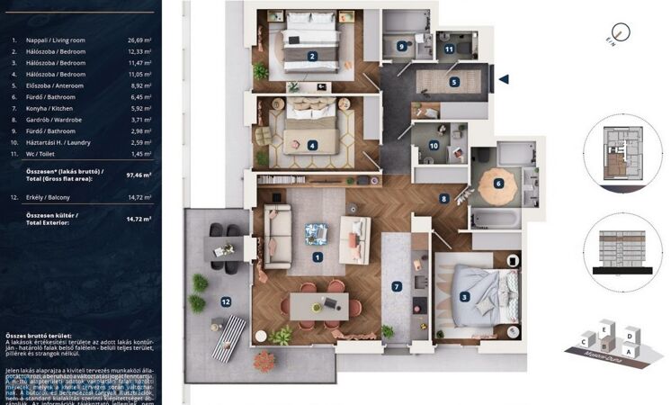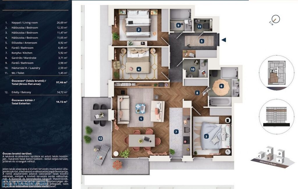 • 97,46 m² alapterület („nettó” 93,56 m2, „bruttó” 97,46 m2 alapterületű)