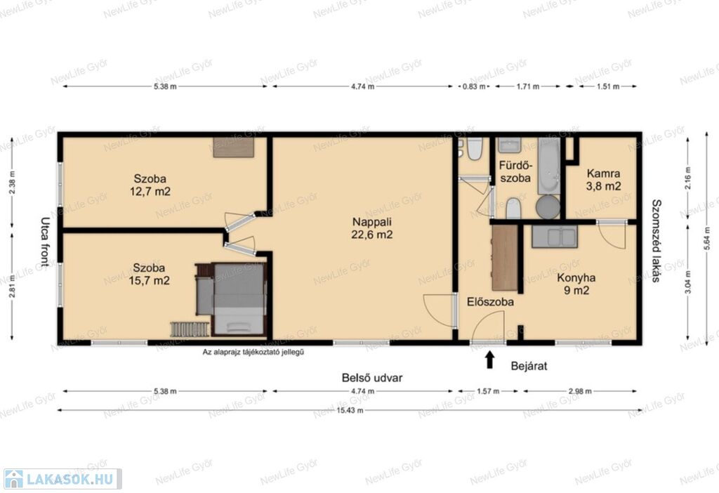 Győr belvárosától mindössze 800 méterre, a Rába folyó mellett, a töltés utáni első utcában eladó ez a 75 m2 nagy lakás, mely egy osztatlan közös udvart használ másod magával.