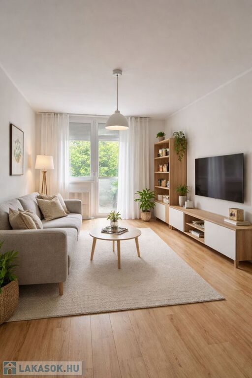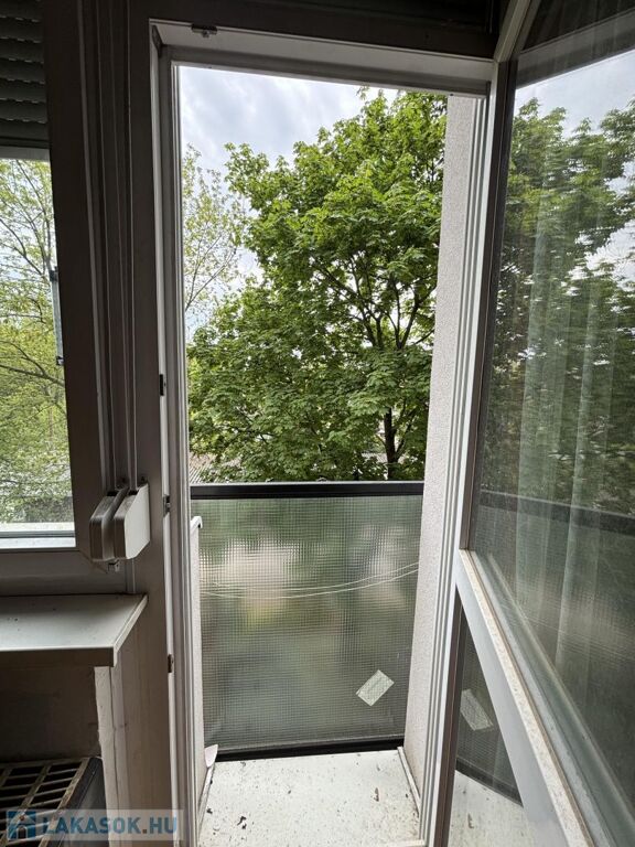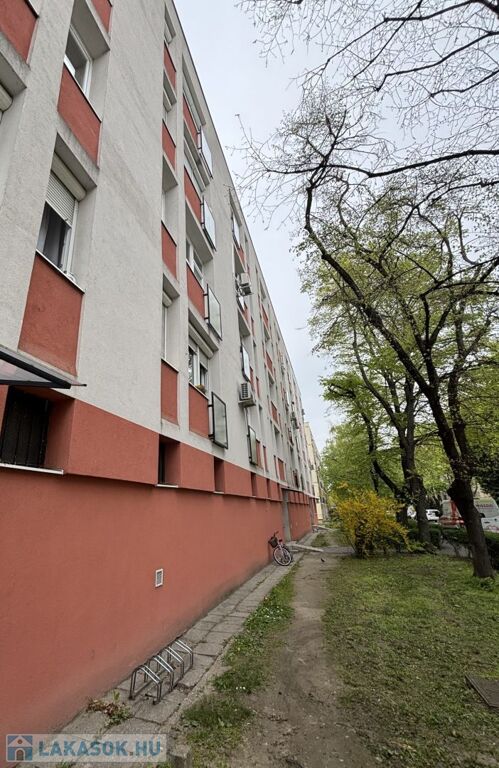 Az ingatlan egy négyszintes társasház első emeletén található, ablakai nem az utcára, hanem egy csendes, fás területre néznek.