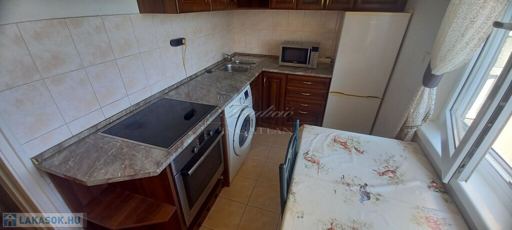 A távfűtéses ingatlan, jó minőségű konyhabútorral van szerelve, amelyben még a mosógép is helyet kapott.